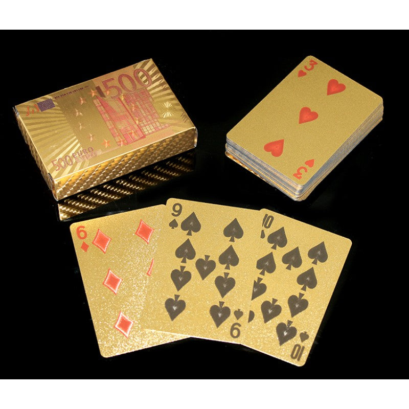 Şık ve lüks tasarımıyla dikkat çeken varaklı Euro oyun kartı, dayanıklı malzemeden üretilmiş olup uzun süreli kullanım sağlar. Altın yaldızlı yüzeyi, kartlara zarif ve premium bir görünüm kazandırırken, suya ve yıpranmaya karşı dayanıklı yapısı sayesinde klasik kart destelerine göre daha uzun ömürlüdür. Özel 500 Euro banknot tasarımıyla koleksiyoncular ve kart oyunu severler için krallara layık bir tercihtir.