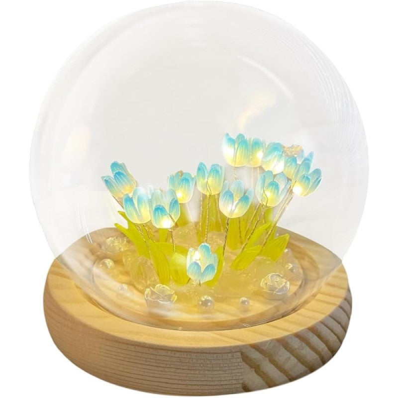 Şeffaf cam fanus, yapay lale çiçekleri, kristal taşlar ve ahşap taban. LED ışıklarla donatarak, sıcak bir ışık yayarak hoş bir atmosfer oluşturur.